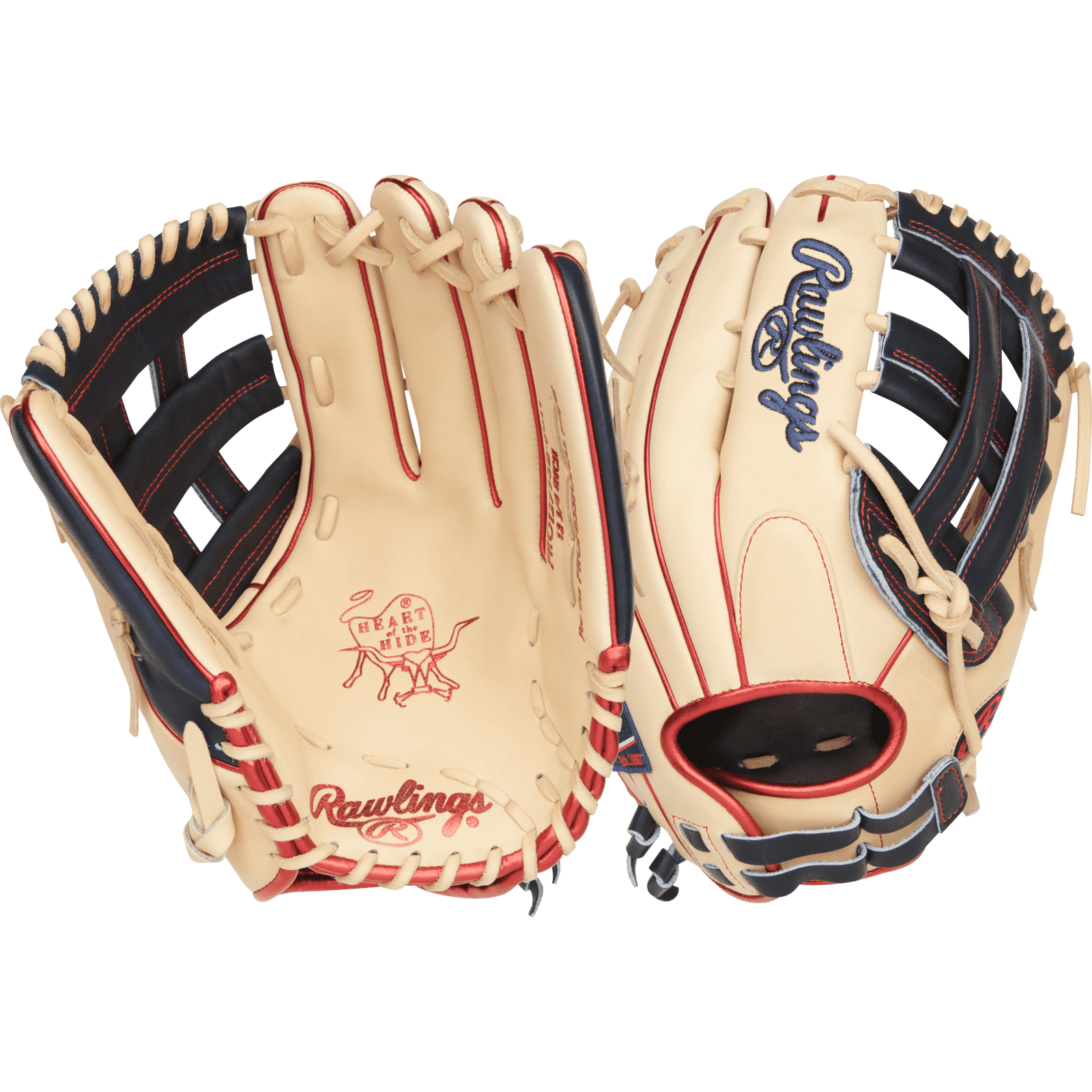 Command the outfield with the Rawlings 12.75-inch Heart of the Hide Outfield Fastpitch glove. This glove sports a beautiful camel and navy leather that helps highlight the scarlet red stamping and wetling!