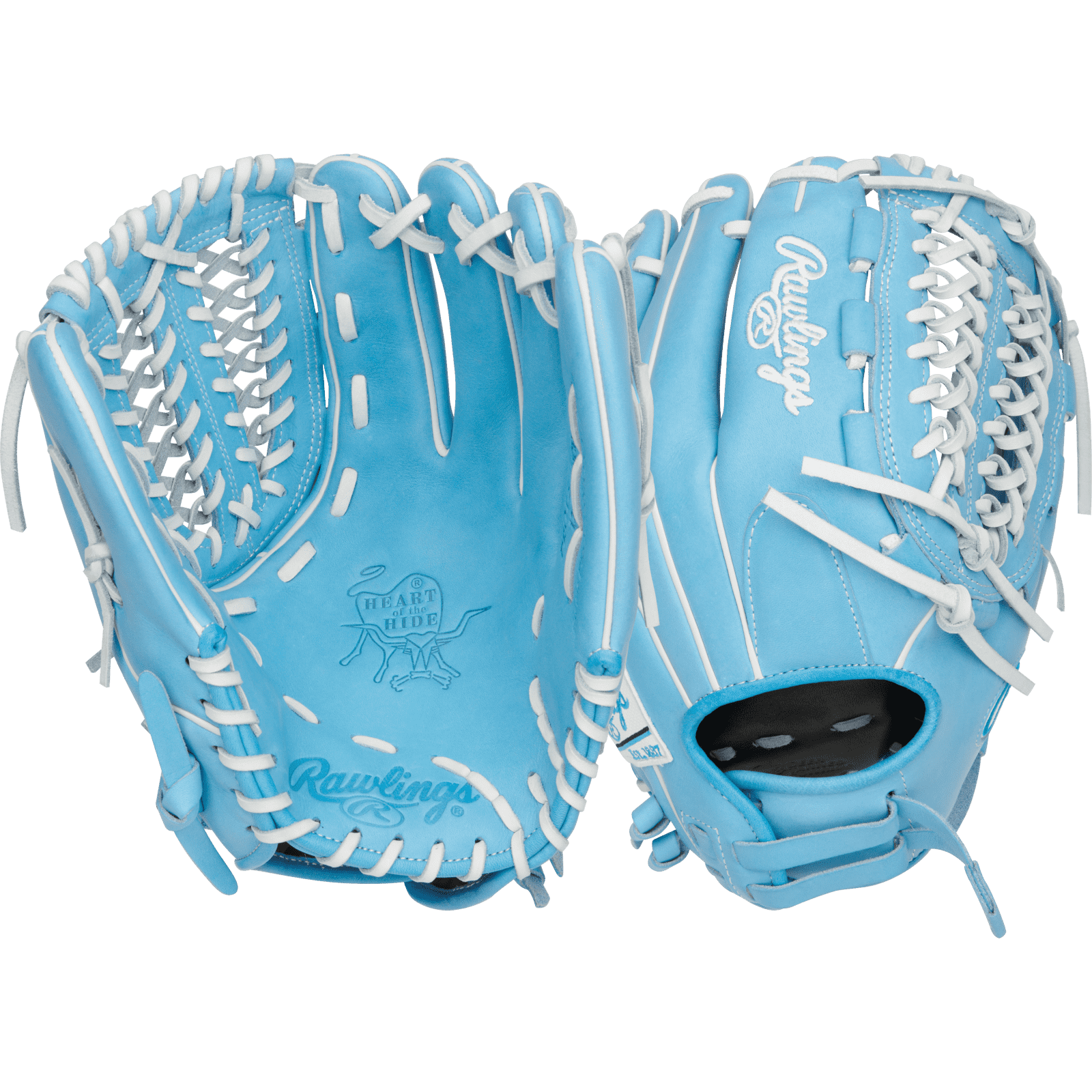 Dominate any position on the field with the Rawlings 12.5-inch Heart of the Hide Utility Fastpitch Glove. Its eye-catching Columbia blue leather meshes well with all of the white accents of the laces, welting, and Oval-R.