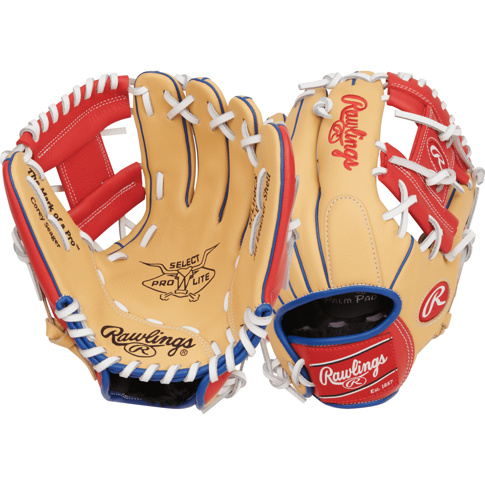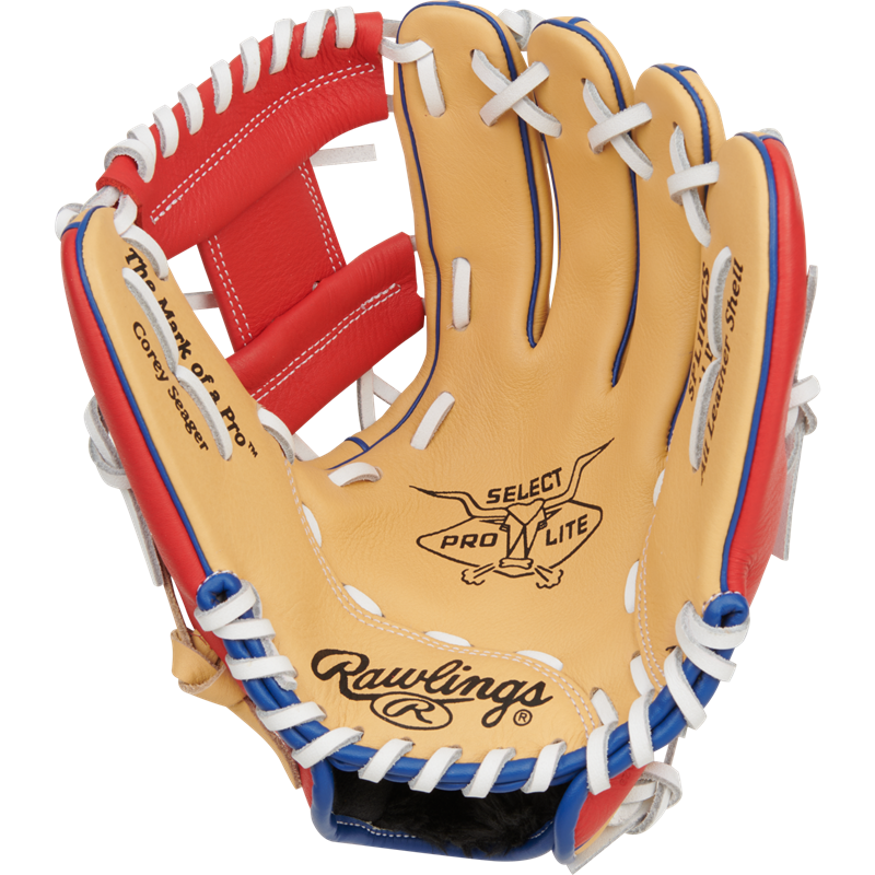 The Rawlings Corey Seager Select Pro Lite infield glove is the ultimate mitt to bring some swagger and glove features of your favorite player to the field! This Corey Seager 11-in features a Pro-I web, allowing for smooth transitions and clean plays all around the diamond. Additionally, this youth glove offers a camel shell, scarlet red features, and a blue lining, perfect for repping Corey and the Rangers on the field.