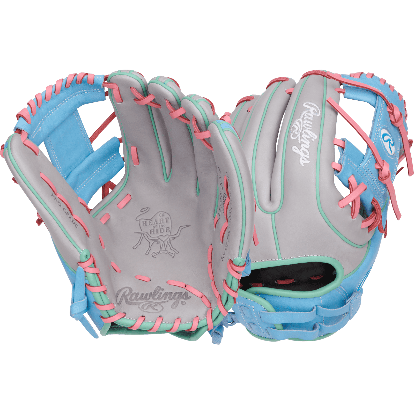 Time to be flashy with the Rawlings 12-inch Heart of the Hide Infield Fastpitch glove. This glove features a sleek gray and Columbia blue colorway, highlighted by pink laces and mint green welting!