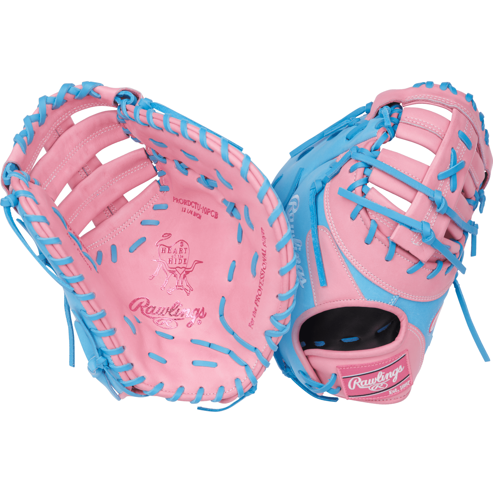 Make a bold statement at first base with the Rawlings Heart of the Hide 12.75-Inch First Base Mitt. This glove features a fresh Pink and Columbia Blue colorway that blends elite style with legendary performance.