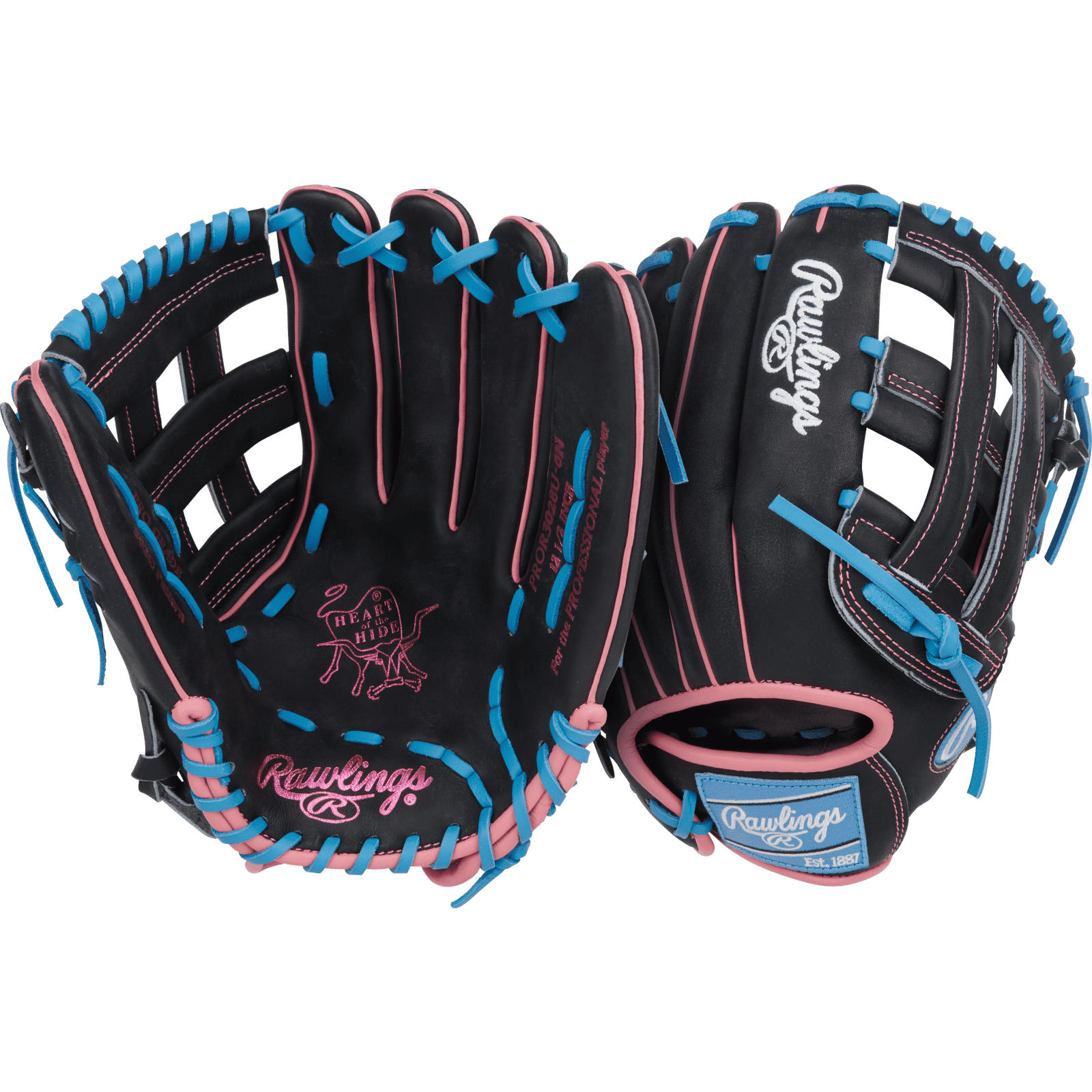 The Rawlings Heart of the Hide 12.5-Inch Utility Glove features a versatile 302U pattern, ContoUR Fit for smaller hands, and a bold Black/Columbia Blue/Pink look.