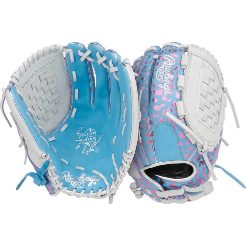 Show out in the outfield with the Rawlings Heart of the Hide 12.5-inch softball glove, featuring pro-grade leather and a Columbia Blue/White/Pink colorway.