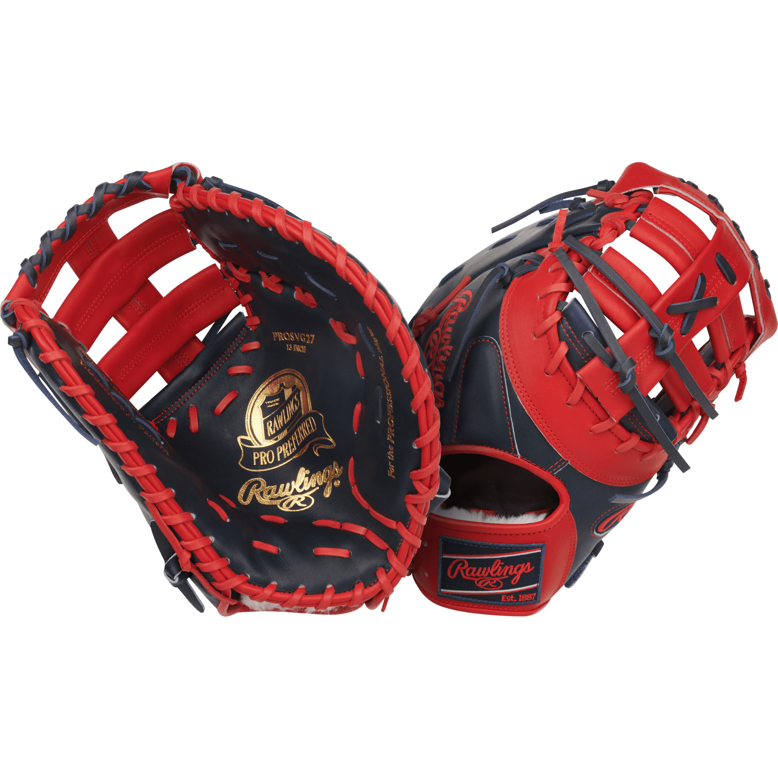 The Rawlings Pro Preferred 13-Inch First Base Mitt features Vladimir Guerrero Jr.’s DCT pattern, premium kip leather, and a bold Navy/Scarlet design.