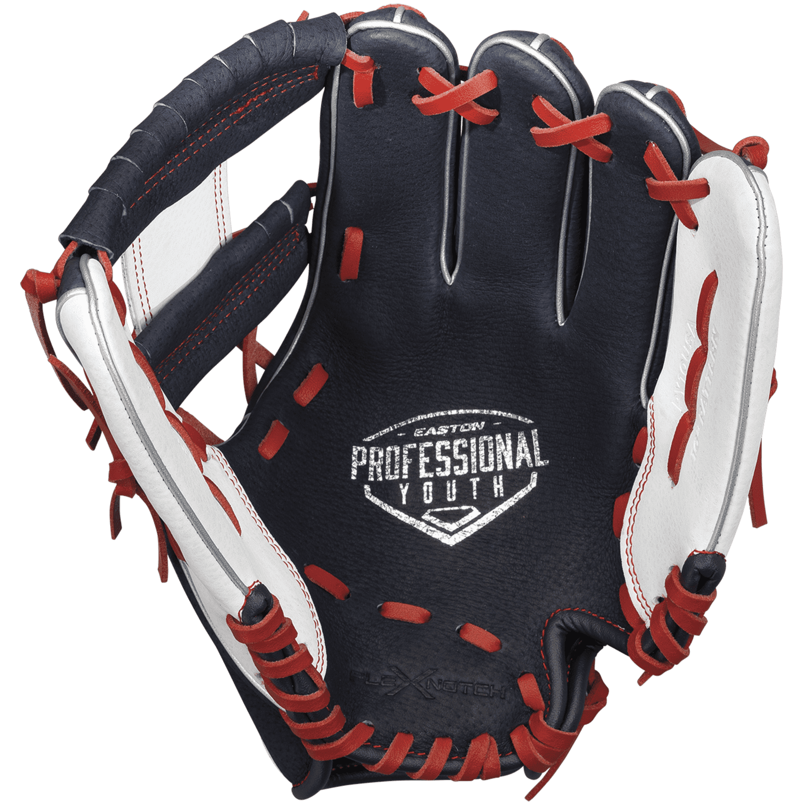 Youth players will feel like big leaguers with Easton’s Professional Youth Series. Specifically designed for the 8U player, the Professional Youth Series is made with soft genuine pigskin leather and combined with an embossed Hyperlite synthetic, keeping the glove nice and light for young players. The Flex Notch™ closure system makes the glove easy to squeeze, and extended finger gussets provide a better fit and more leverage for catching the ball. Professional-style embroidered Easton and Screamin’ E logos finish off the glove.
